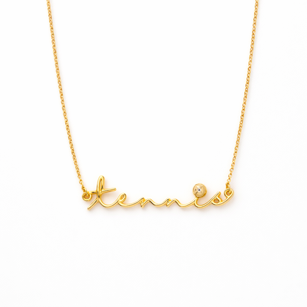 A palavra tennis transformada em joia com uma pequena bola de tênis no lugar do ponto do “i”.