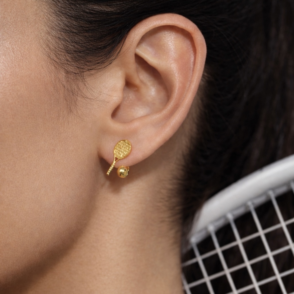 Inspirado no universo do tênis, este brinco em formato de raquete traduz a elegância do esporte em uma joia delicada e contemporânea. O desenho em miniatura reproduz a textura das cordas da raquete, trazendo personalidade e identidade esportiva à peça.
